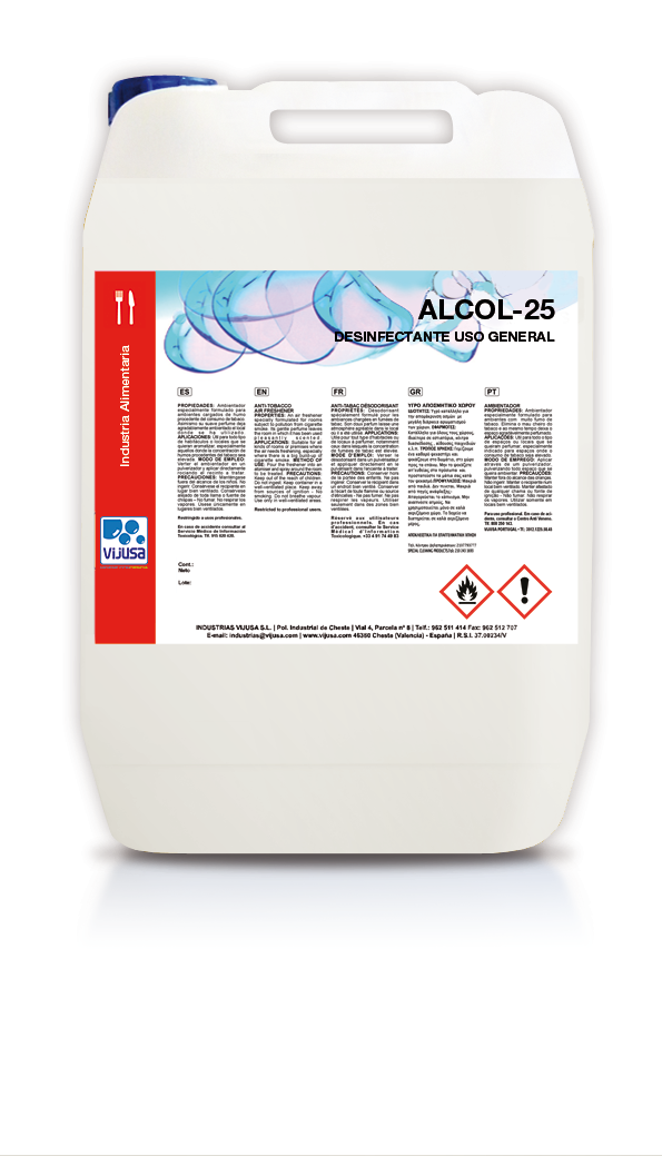 Desinfectante líquido de base alcohólica de aplicación por pulverización, listo para usar en las industrias de procesado de alimentos, bebidas y lácteas.